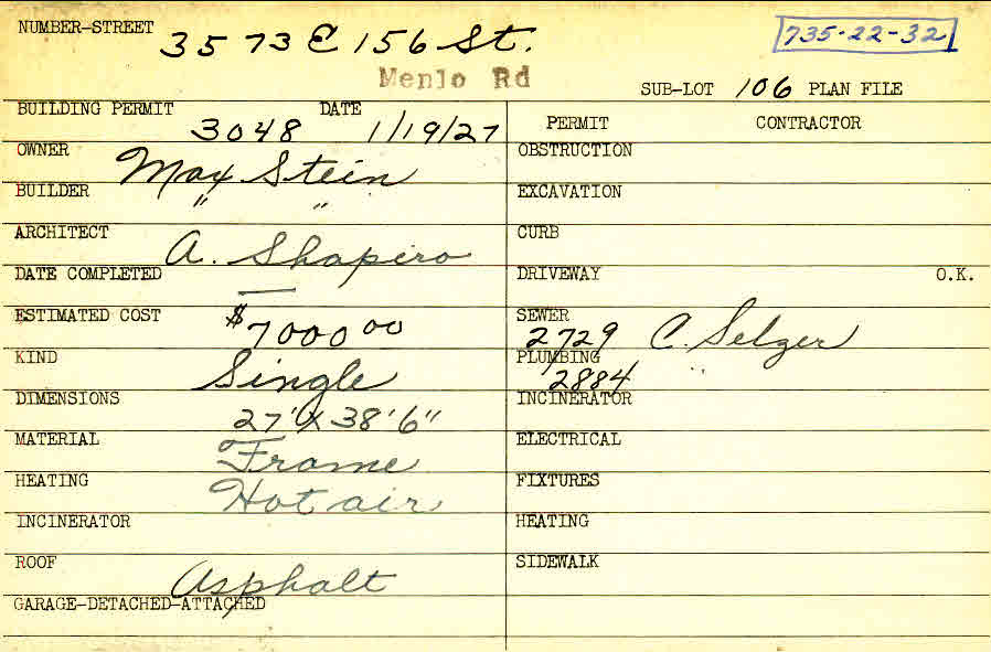 3573 Menlo Road Shaker Heights, OH 44120 PARCEL ID: 735-22-032 Building Permit Date: 01-19-1927 Plan File Number: 0 Neighborhood: Moreland Owner: Stein, Max Builder: Stein, Max Architect: Shapiro, A. Estimated Cost: 7000 Kind: Single, Single Residence or Dwelling Material: Frame Heating: Hot Air Roof: Asphalt Card Available: yes |
