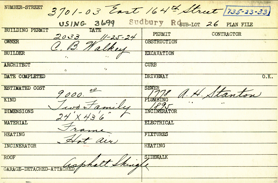 3701 Sudbury Road Shaker Heights, OH 44120 PARCEL ID: 735-23-033 Building Permit Date: 11-25-1924 Plan File Number: 1385 all scanned Microfilm Roll: Roll016 Neighborhood: Moreland Owner: Walkey, C. B. Builder: Walkey, C. B. Architect: Walkey, C. B. Estimated Cost: 9000 Kind: Duplex or Two-Family Material: Frame Heating: Hot Air Roof: Asphalt Shingles |