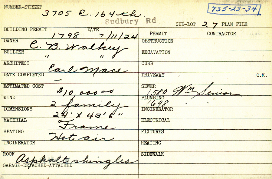 3705 Sudbury Road Shaker Heights, OH 44120 PARCEL ID: 735-23-034 Building Permit Date: 07-11-1924 Plan File Number: 599 all scanned Microfilm Roll: Roll007 Neighborhood: Moreland Owner: Walkey.C. B. Builder: Walkey.C. B. Architect: Mace, Earl Estimated Cost: 10000 Kind: Duplex or Two-Family Material: Frame Heating: Hot Air Roof: Asphalt Shingles |