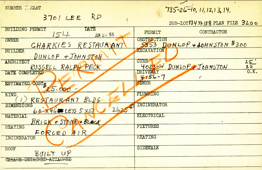 3701 Lee Road Shaker Heights, OH 44120 PARCEL ID: 735-26-012 Building Permit Date: 06-30-1955 Plan File Number: 3200 Microfilm Roll: Roll#47 Owner: Charkie's Restaurant Builder: Dunlop & Johnston Architect: Peck, Russell Ralph Estimated Cost: 25000 Kind: Commercial - Retail or Office Material: Brick and Stone and Block Heating: Forced Air Card Available: Yes |  |