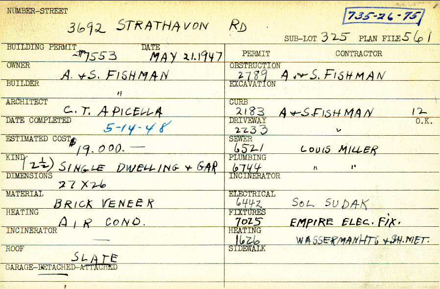 3692 Strathavon Road Shaker Heights, OH 44120 PARCEL ID: 735-26-075 Building Permit Date: 05-21-1947 Plan File Number: 561 all scanned Microfilm Roll: Roll007 Neighborhood: Lomond Owner: Fishman, A. and S. Builder: Fishman, A. and S. Architect: Apicella, C. T. Estimated Cost: 19000 Date Completed: 05-14-1948 Kind: Single 2-1/2 Material: Brick Veneer Heating: Air Conditioned Roof: Slate Garage: detached |