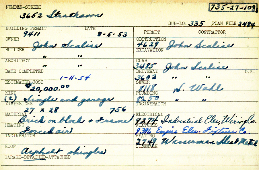 3652 Strathavon Road Shaker Heights, OH 44120 PARCEL ID: 735-27-108 Building Permit Date: 08-05-1953 Plan File Number: 2484 all scanned Microfilm Roll: Roll035 Neighborhood: Lomond Owner: Scalise, John Builder: Scalise, John Architect: Scalise, John Estimated Cost: 20000 Date Completed: 01-11-1954 Kind: Single Dwelling and Garage (2) Material: Brick on Block and Frame Heating: Forced Air Roof: Asphalt Shingles Garage: detached |