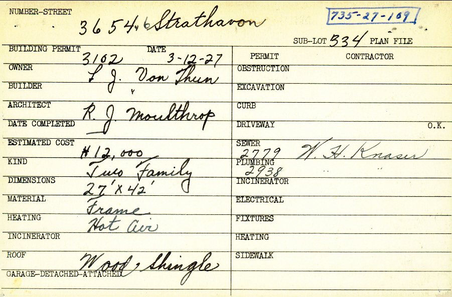 3656 Strathavon Road Shaker Heights, OH 44120 PARCEL ID: 735-27-109 Building Permit Date: 03-12-1927 Plan File Number: 0 Neighborhood: Lomond Owner: Von Thun, L. J. Builder: Von Thun, L. J. Architect: Moulthrop, R. J. Estimated Cost: 12000 Kind: Duplex or Two-Family Material: Frame Heating: Hot Air Roof: Wood Shingle |