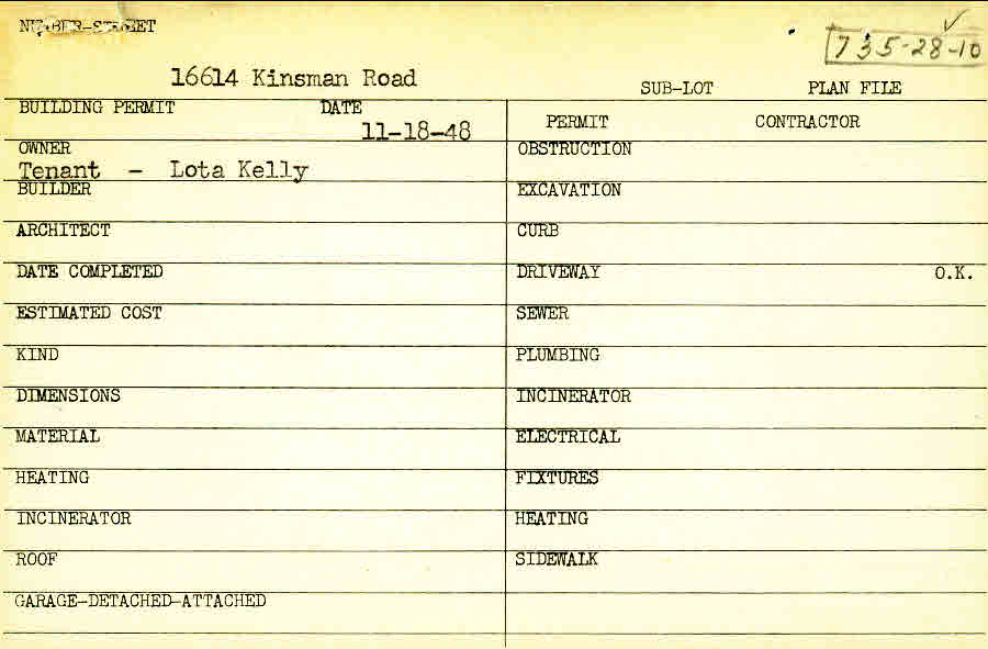 16614 Chagrin Boulevard Shaker Heights, OH 44120 PARCEL ID: 735-28-010 Building Permit Date: 11-18-1948 Plan File Number: 1395 scanned, 4489, 7922, 12361 Microfilm Roll: Roll016, Roll#63, Roll#95, NewRoll#12 Neighborhood: Moreland Owner: Kelly, Lota (Tenant) Card Available: Yes |