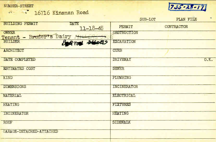16716 Chagrin Boulevard Shaker Heights, OH 44120 PARCEL ID: 735-28-017 Building Permit Date: 11-18-1948 Plan File Number: 996 scanned, 5535, 6403, 9189, 9699, 12538 Microfilm Roll: Roll012, Roll#75, Roll#85, Roll#102, Roll#104, NewRoll#13 Neighborhood: Moreland Owner: Barton Shoes (Tenant) Card Available: Yes |