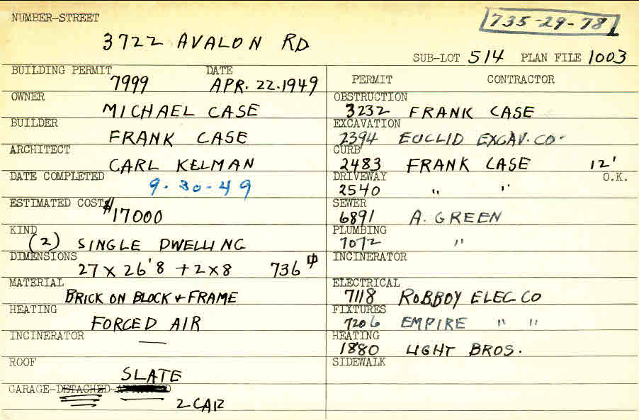 3722 Avalon Road Shaker Heights, OH 44120 PARCEL ID: 735-29-078 Building Permit Date: 04-22-1949 Plan File Number: 1003 all scanned Microfilm Roll: Roll012 Owner: Case, Michael Builder: Case, Frank Architect: Kelman, Carl Estimated Cost: 17000 Date Completed: 09-30-1949 Kind: Single, Single Residence or Dwelling (2) Material: Brick on Block and Frame Heating: Forced Air Roof: Slate Garage: detached 2 car |