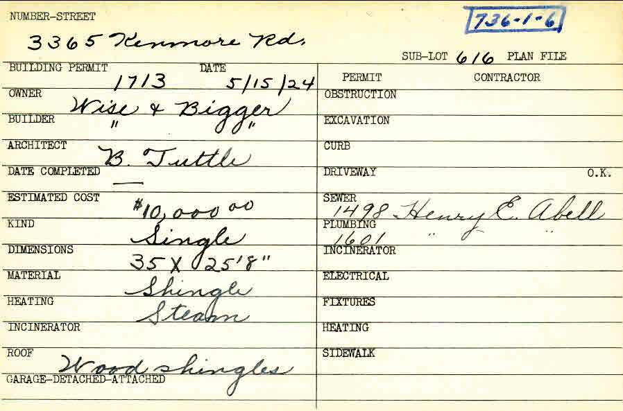 3365 Kenmore Road Shaker Heights, OH 44122 PARCEL ID: 736-01-006 Building Permit Date: 05-15-1924 Plan File Number: 0 Neighborhood: Fernway Owner: Wise and Bigger Builder: Wise and Bigger Architect: Tuttle, Bloodgood Estimated Cost: 10000 Kind: Single, Single Residence or Dwelling Material: Shingle Heating: Steam Roof: Wood Shingle |