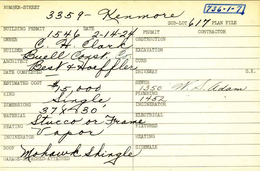 3359 Kenmore Road Shaker Heights, OH 44122 PARCEL ID: 736-01-007 Building Permit Date: 02-14-1924 Plan File Number: 0 Neighborhood: Fernway Owner: Clark, C. H. Builder: Buell Construction Company Architect: Best and Hoefler Estimated Cost: 15000 Kind: Single, Single Residence or Dwelling Material: Stucco or Frame Heating: Vapor Roof: Shingles |