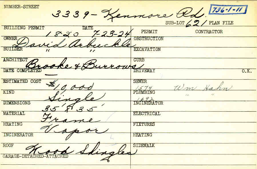3339 Kenmore Road Shaker Heights, OH 44122 PARCEL ID: 736-01-011 Building Permit Date: 07-23-1924 Plan File Number: 0 Neighborhood: Fernway Owner: Arbuckle, David Builder: Arbuckle, David Architect: Brooke and Burrows Estimated Cost: 10000 Kind: Single, Single Residence or Dwelling Material: Frame Heating: Vapor Roof: Wood Shingle Card Available: yes |