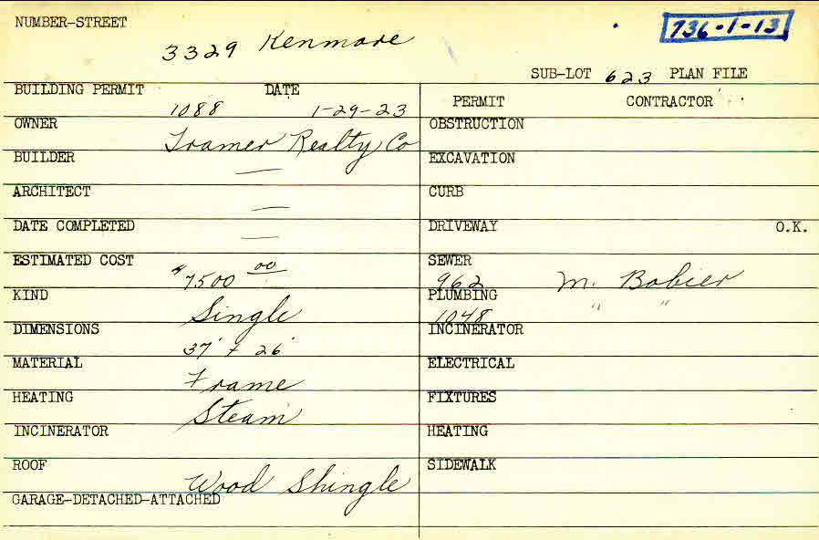 3329 Kenmore Road Shaker Heights, OH 44122 PARCEL ID: 736-01-013 Building Permit Date: 01-29-1923 Plan File Number: 13070 all scanned Microfilm Roll: NewRoll19 Neighborhood: Fernway Owner: Tramer Realty Company Estimated Cost: 7500 Kind: Single, Single Residence or Dwelling Material: Frame Heating: Steam Roof: Wood Shingle |