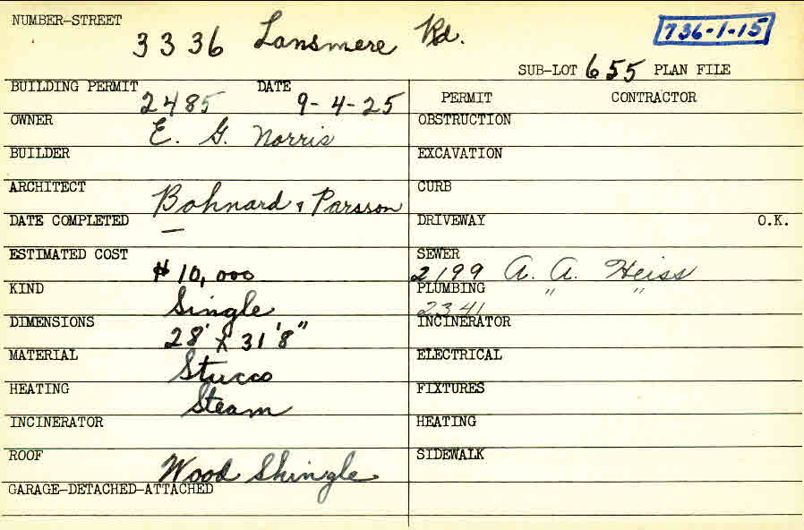 3336 Lansmere Road Shaker Heights, OH 44122 PARCEL ID: 736-01-015 Building Permit Date: 09-04-1925 Plan File Number: 0 Neighborhood: Fernway Owner: Norris, E. G. Architect: Bohnard and Parsson Estimated Cost: 10000 Kind: Single, Single Residence or Dwelling Material: Stucco Heating: Steam Roof: Wood Shingle Card Available: yes |