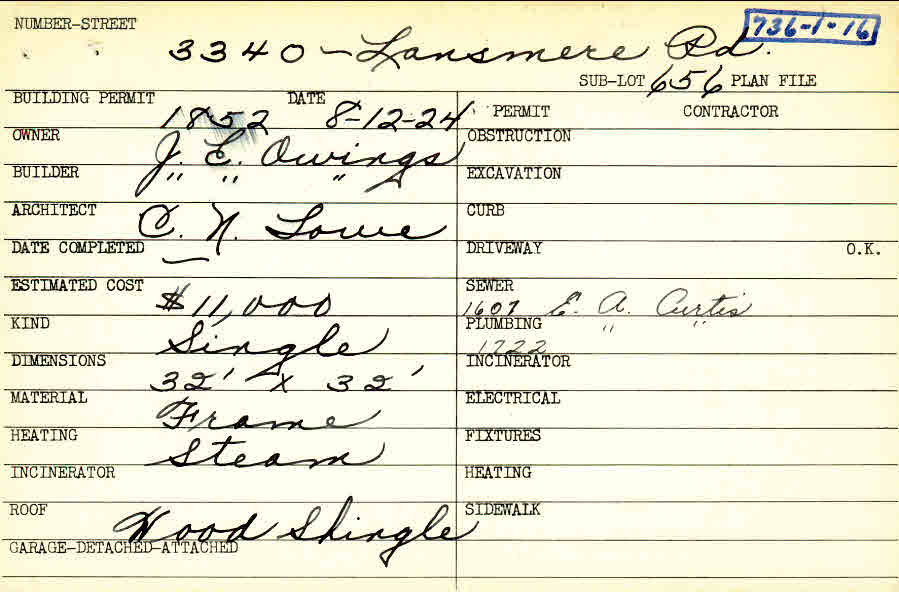 3340 Lansmere Road Shaker Heights, OH 44122 PARCEL ID: 736-01-016 Building Permit Date: 08-12-1924 Plan File Number: 0 Neighborhood: Fernway Owner: Owings, J. E. Builder: Owings, J. E. Architect: Lowe, C. N. Estimated Cost: 11000 Kind: Single, Single Residence or Dwelling Material: Frame Heating: Steam Roof: Wood Shingle Card Available: yes |