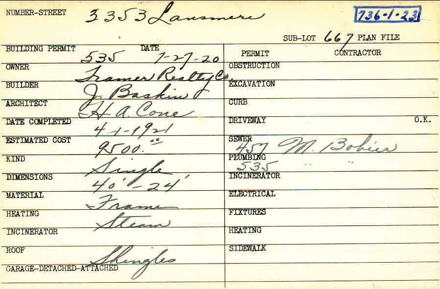 3353 Lansmere Road Shaker Heights, OH 44122 PARCEL ID: 736-01-023 Building Permit Date: 07-27-1920 Plan File Number: 6086, 6270 Microfilm Roll: Roll#81, Roll#84 Neighborhood: Fernway Owner: Tramer Realty Company Builder: Baskin, J. Architect: Cone, Harry A. Estimated Cost: 9500 Date Completed: 04-01-1921 Kind: Single, Single Residence or Dwelling Material: Frame Heating: Steam Roof: Shingles |