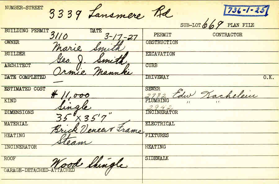 3339 Lansmere Road Shaker Heights, OH 44122 PARCEL ID: 736-01-025 Building Permit Date: 03-17-1927 Plan File Number: 7145, 11674 Microfilm Roll: Roll#91, NewRoll#8 Neighborhood: Fernway Owner: Smith, Marie Builder: Smith, George J. Architect: Mannki, Ormie Estimated Cost: 11000 Kind: Single, Single Residence or Dwelling Material: Brick Veneer and Frame Heating: Steam Roof: Wood Shingle |