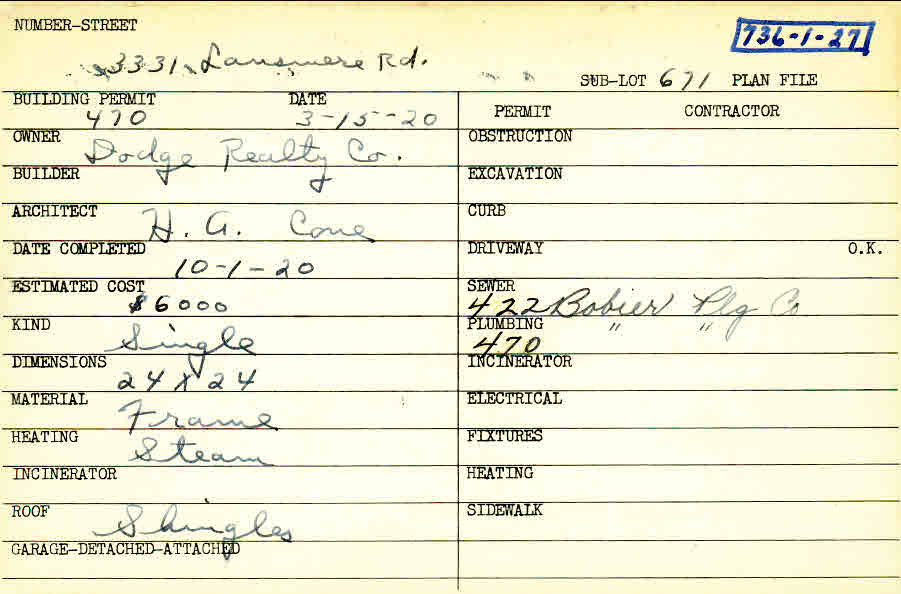 3331 Lansmere Road Shaker Heights, OH 44122 PARCEL ID: 736-01-027 Building Permit Date: 03-15-1920 Plan File Number: 1732 scanned, 9200 Microfilm Roll: Roll026, Roll#102 Neighborhood: Fernway Owner: Dodge Realty Company Architect: Cone, Harry A. Estimated Cost: 6000 Date Completed: 10-01-1920 Kind: Single, Single Residence or Dwelling Material: Frame Heating: Steam Roof: Shingles |