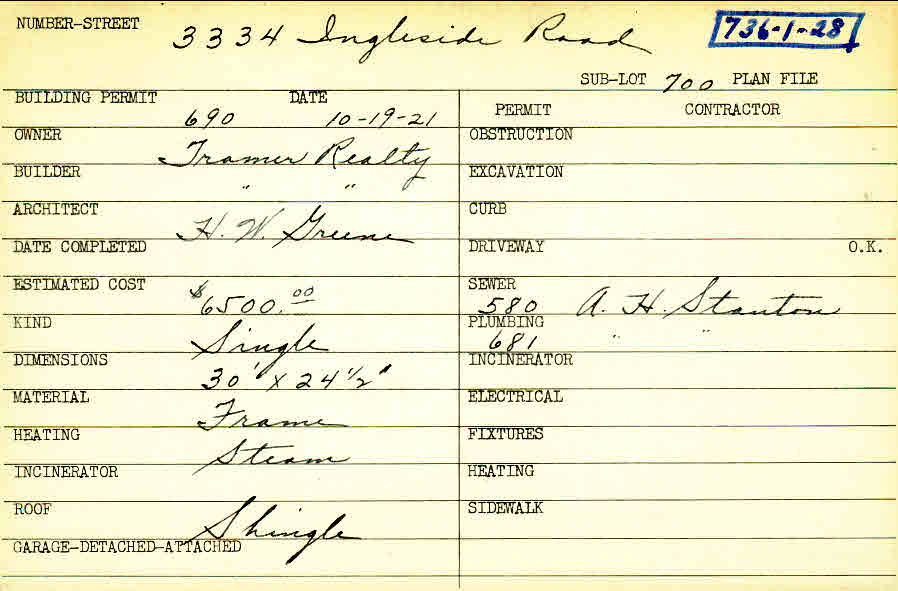 3334 Ingleside Road Shaker Heights, OH 44122 PARCEL ID: 736-01-028 Building Permit Date: 10-19-1921 Plan File Number: 0 Neighborhood: Fernway Owner: Tramer Realty Builder: Tramer Realty Architect: Greene, H. W. Estimated Cost: 6500 Kind: Single, Single Residence or Dwelling Material: Frame Heating: Steam Roof: Shingles Card Available: yes |