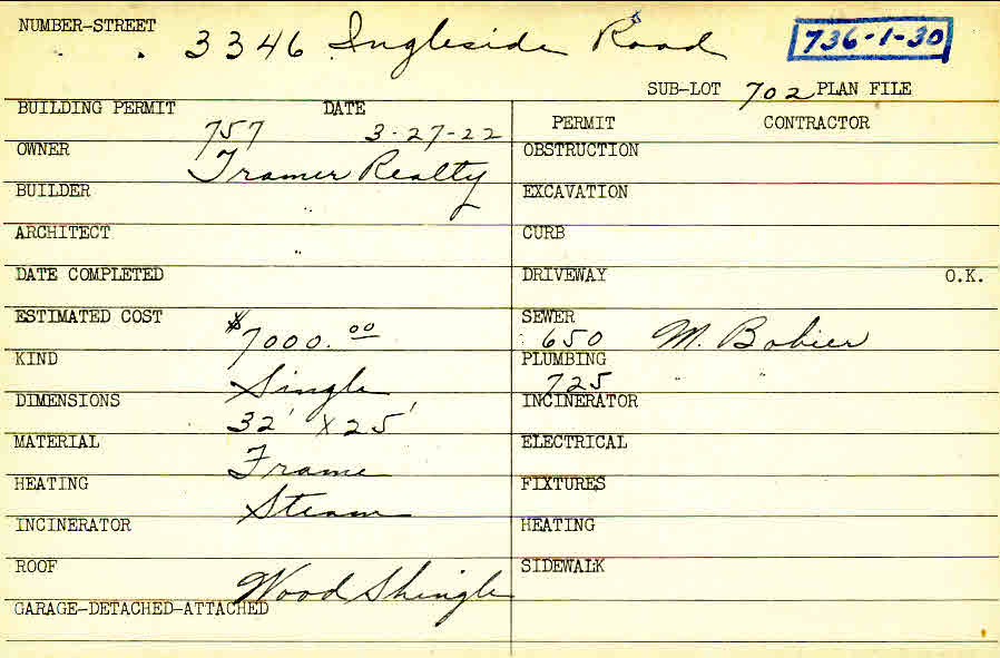 3346 Ingleside Road Shaker Heights, OH 44122 PARCEL ID: 736-01-030 Building Permit Date: 03-27-1922 Plan File Number: 0 Neighborhood: Fernway Owner: Tramer Realty Builder: Tramer Realty Architect: Tramer Realty Estimated Cost: 7000 Kind: Single, Single Residence or Dwelling Material: Frame Heating: Steam Roof: Wood Shingle Card Available: yes |