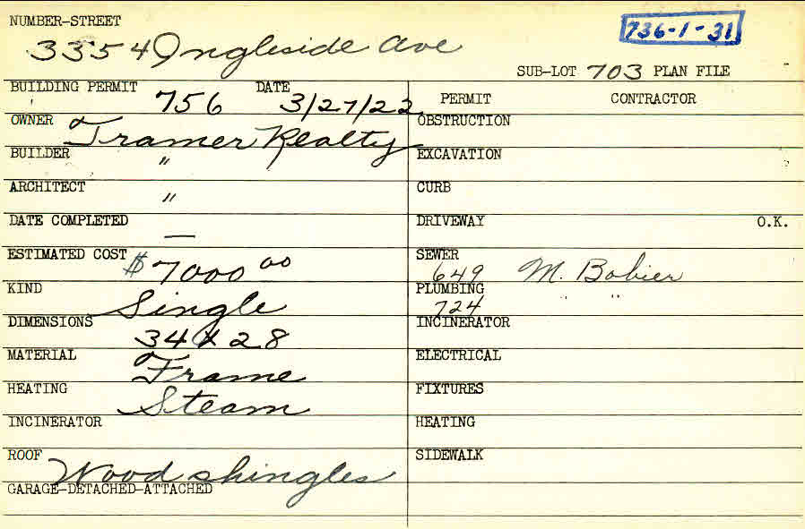 3354 Ingleside Road Shaker Heights, OH 44122 PARCEL ID: 736-01-031 Building Permit Date: 03-27-1922 Plan File Number: 4306 all scanned Microfilm Roll: Roll062 Neighborhood: Fernway Owner: Tramer Realty Builder: Tramer Realty Architect: Tramer Realty Estimated Cost: 7000 Kind: Single, Single Residence or Dwelling Material: Frame Heating: Steam Roof: Wood Shingle Blueprints: online, see link above |