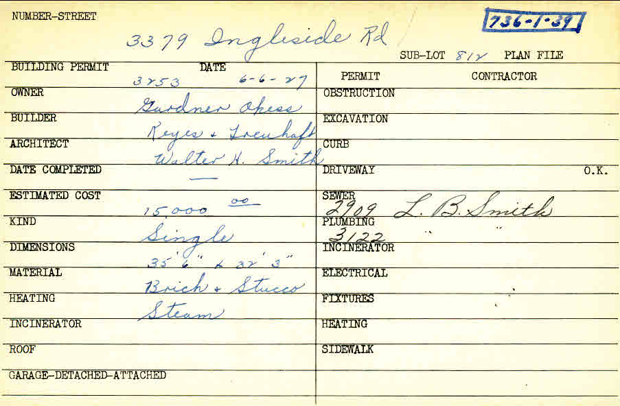 3379 Ingleside Road Shaker Heights, OH 44122 PARCEL ID: 736-01-039 Building Permit Date: 06-06-1927 Plan File Number: 0 Neighborhood: Fernway Owner: Okess, Gardner Builder: Keyes and Treuhaft Architect: Smith, Walter H. Estimated Cost: 15000 Kind: Single, Single Residence or Dwelling Material: Brick and Stucco Heating: Steam Card Available: yes |