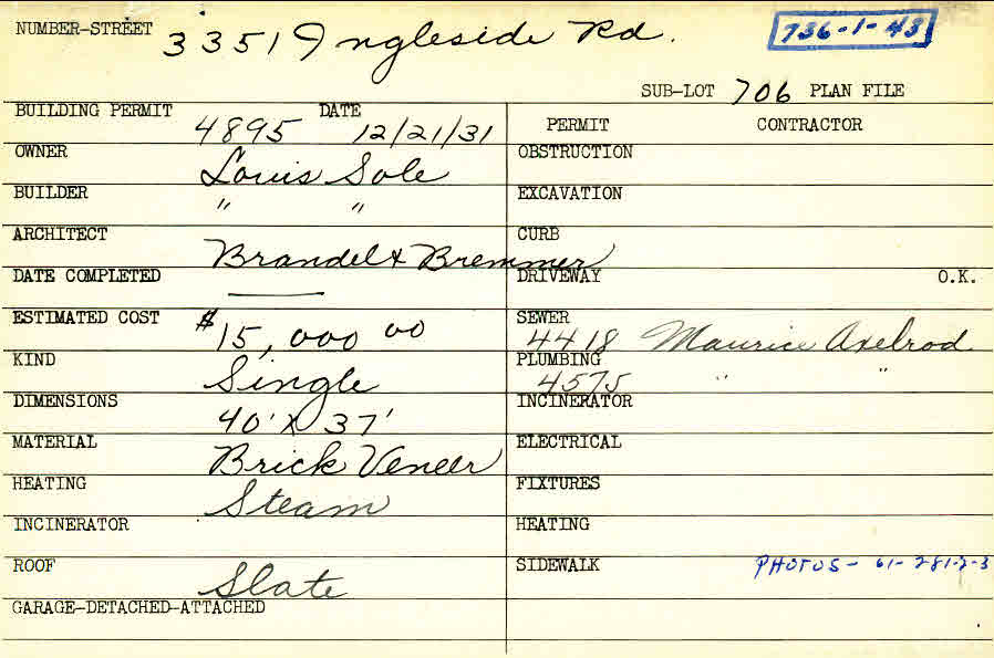 3351 Ingleside Road Shaker Heights, OH 44122 PARCEL ID: 736-01-043 Building Permit Date: 12-21-1931 Plan File Number: 5398, 5723, 7056 Microfilm Roll: Roll#73, Roll#77, Roll#90 Neighborhood: Fernway Owner: Sole, Louis Builder: Sole, Louis Architect: Brandel and Bremmer Estimated Cost: 15000 Kind: Single, Single Residence or Dwelling Material: Brick Veneer Heating: Steam Roof: Slate |