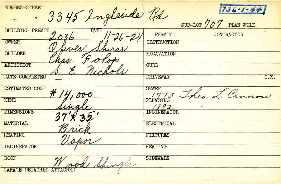 3345 Ingleside Road Shaker Heights, OH 44122 PARCEL ID: 736-01-044 Building Permit Date: 11-26-1924 Plan File Number: 5420 Microfilm Roll: Roll#73 Neighborhood: Fernway Owner: Shiras, Oliver Builder: Folop, Charles Architect: Nichols, S. E. Estimated Cost: 14000 Kind: Single, Single Residence or Dwelling Material: Brick Heating: Vapor Roof: Wood Shingle |
