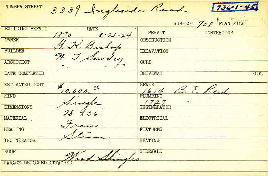 3339 Ingleside Road Shaker Heights, OH 44122 PARCEL ID: 736-01-045 Building Permit Date: 08-21-1924 Plan File Number: 5498 Microfilm Roll: Roll#74 Neighborhood: Fernway Owner: Bishop, G.K. Builder: Sawdey, N. T. Architect: Sawdey, N. T. Estimated Cost: 10000 Kind: Single, Single Residence or Dwelling Material: Frame Heating: Steam Roof: Wood Shingle |