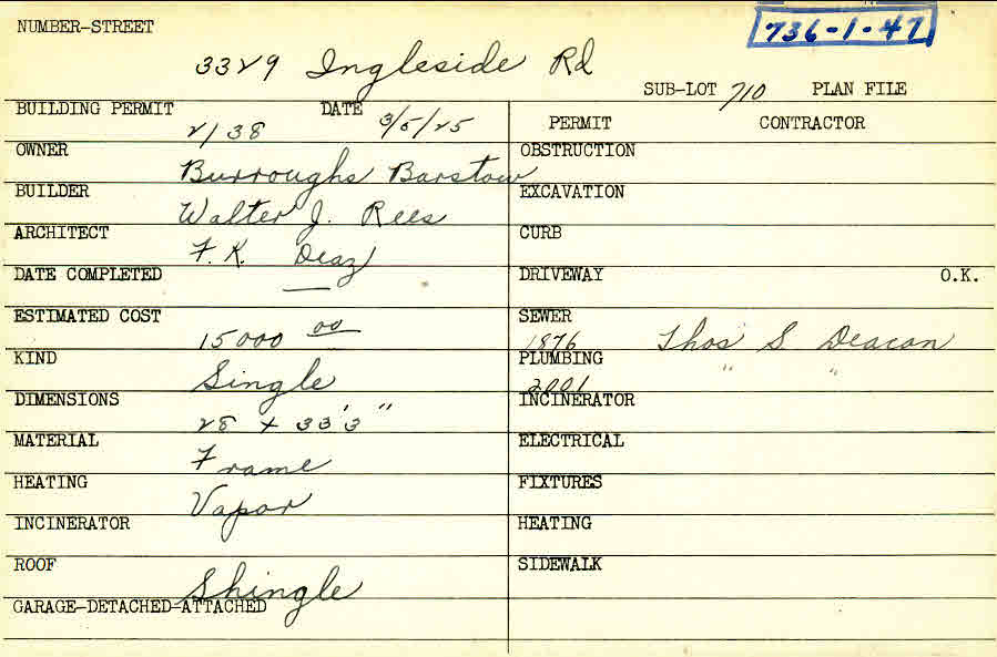3329 Ingleside Road Shaker Heights, OH 44122 PARCEL ID: 736-01-047 Building Permit Date: 03-05-1925 Plan File Number: 0 Neighborhood: Fernway Owner: Barstow, Burroughs Builder: Rees, Walter J. Architect: Deaz, F. K. Estimated Cost: 15000 Kind: Single, Single Residence or Dwelling Material: Frame Heating: Vapor Roof: Shingles Card Available: yes |