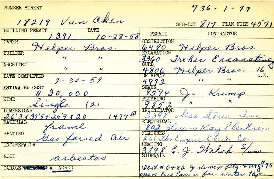 18219 Van Aken Boulevard Shaker Heights, OH 44120 PARCEL ID: 736-01-077 Building Permit Date: 10-26-1958 Plan File Number: 4571 Microfilm Roll: Roll#64 Neighborhood: Lomond Owner: Helper Brothers Builder: Helper Brothers Architect: Helper Brothers Estimated Cost: 30000 Date Completed: 07-28-1959 Kind: Single, Single Residence or Dwelling (2) Material: Frame Heating: Forced Air Roof: Asbestos Garage: attached |