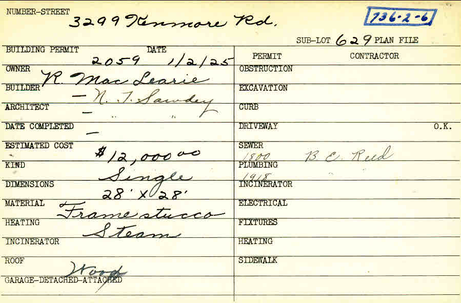 3299 Kenmore Road Shaker Heights, OH 44122 PARCEL ID: 736-02-006 Building Permit Date: 01-02-1925 Plan File Number: 12575 Microfilm Roll: NewRoll#14 Neighborhood: Fernway Owner: MacLearie, R. Builder: Sawdey, N. T. Architect: Sawdey, N. T. Estimated Cost: 12000 Kind: Single, Single Residence or Dwelling Material: Frame Stucco Heating: Steam Roof: Wood |