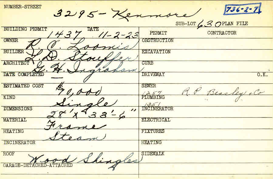 3295 Kenmore Road Shaker Heights, OH 44122 PARCEL ID: 736-02-007 Building Permit Date: 11-02-1923 Neighborhood: Fernway Owner: Loomis, R. C. Builder: Stouffer, L. D. Architect: Ingraham, G. H. Estimated Cost: 10000 Kind: Single, Single Residence or Dwelling Material: Frame Heating: Steam Roof: Wood Shingle Blueprints: no blueprints on microfilm |