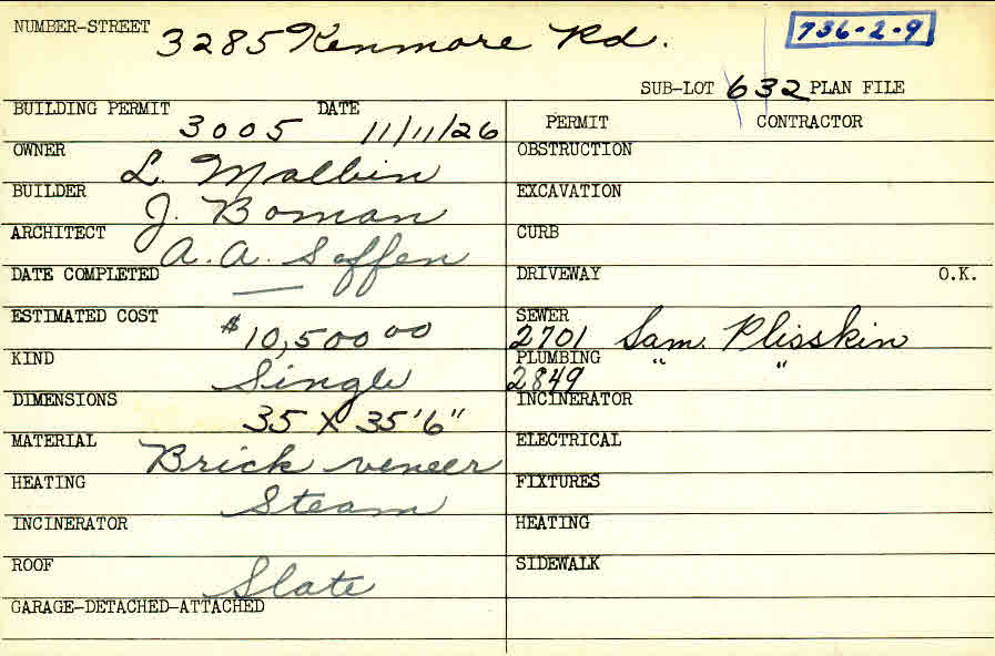 3285 Kenmore Road Shaker Heights, OH 44122 PARCEL ID: 736-02-009 Building Permit Date: 11-11-1926 Plan File Number: 0 Neighborhood: Fernway Owner: Malbin, L Builder: Boman, J. Architect: Soffen, A. A. Estimated Cost: 10500 Kind: Single, Single Residence or Dwelling Material: Brick Veneer Heating: Steam Roof: Slate Card Available: yes |