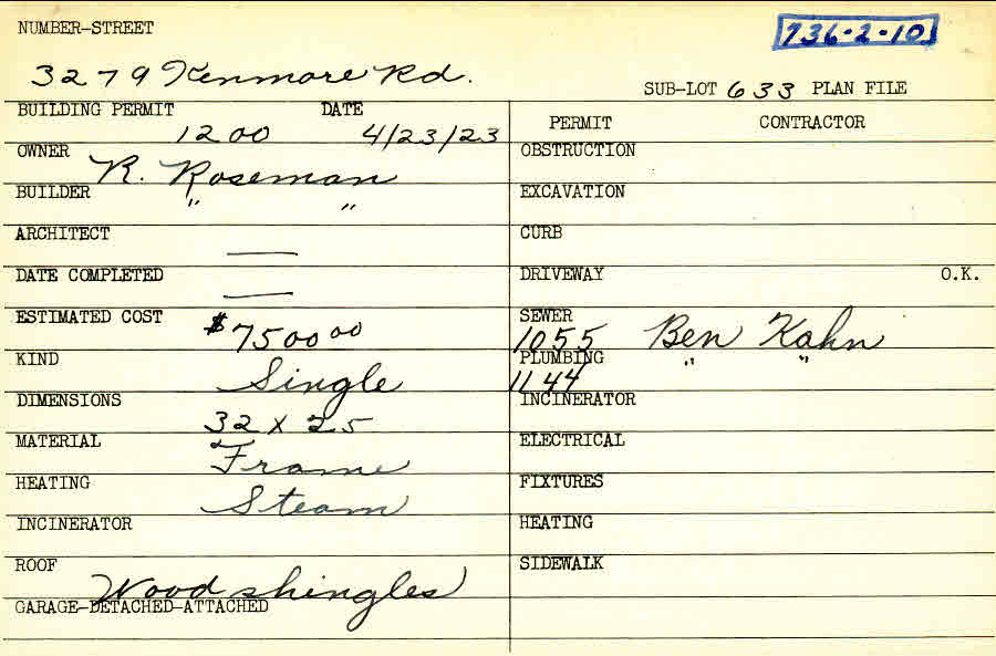 3279 Kenmore Road Shaker Heights, OH 44122 PARCEL ID: 736-02-010 Building Permit Date: 04-23-1923 Plan File Number: 0 Neighborhood: Fernway Owner: Roseman, R. Builder: Roseman, R. Estimated Cost: 7500 Kind: Single, Single Residence or Dwelling Material: Frame Heating: Steam Roof: Wood Shingle Card Available: yes |