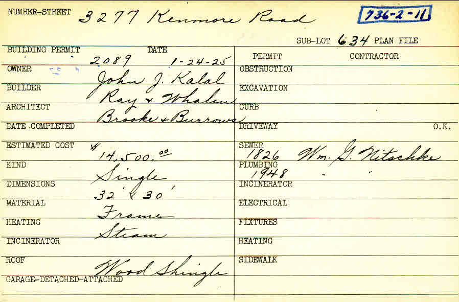 3277 Kenmore Road Shaker Heights, OH 44122 PARCEL ID: 736-02-011 Building Permit Date: 01-24-1925 Plan File Number: 0 Neighborhood: Fernway Owner: Kalal, John J. Builder: Ray and Whalen Architect: Brooke and Burrows Estimated Cost: 14500 Kind: Single, Single Residence or Dwelling Material: Frame Heating: Steam Roof: Wood Shingle Card Available: yes |