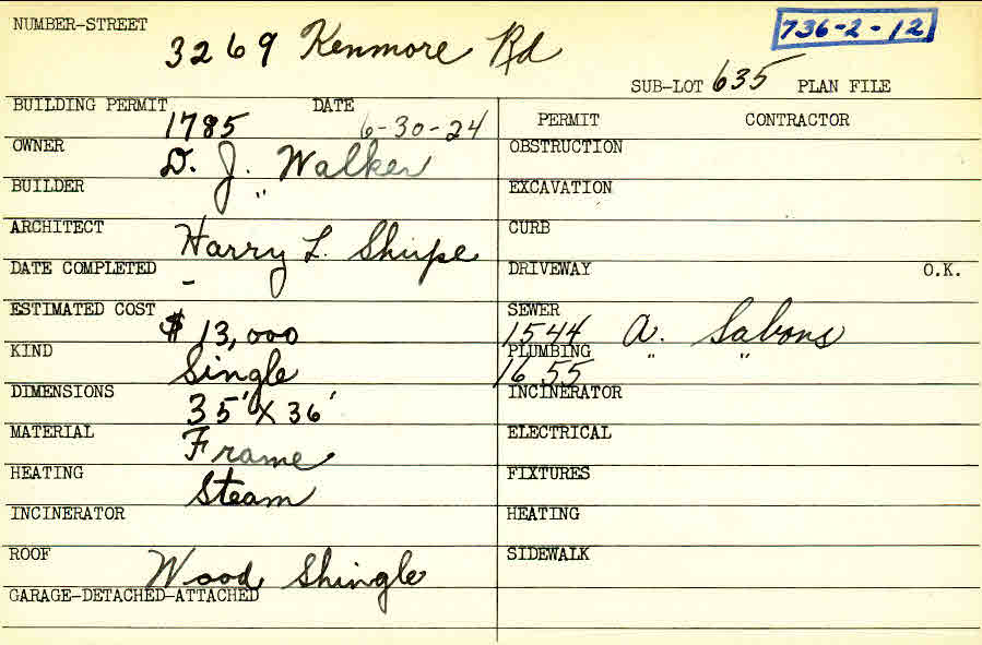 3269 Kenmore Road Shaker Heights, OH 44122 PARCEL ID: 736-02-012 Building Permit Date: 06-30-1924 Plan File Number: 0 Neighborhood: Fernway Owner: Walker, D. J. Builder: Walker, D. J. Architect: Shupe, Harry L. Estimated Cost: 13000 Kind: Single, Single Residence or Dwelling Material: Frame Heating: Steam Roof: Wood Shingle Card Available: yes |