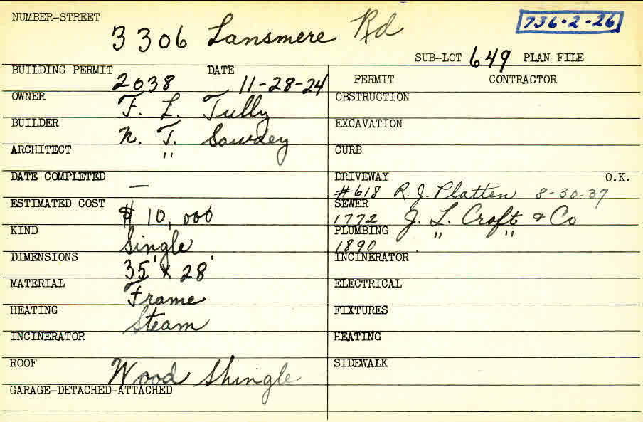 3306 Lansmere Road Shaker Heights, OH 44122 PARCEL ID: 736-02-026 Building Permit Date: 11-28-1924 Plan File Number: 0 Neighborhood: Fernway Owner: Tully, F. L. Builder: Sawdey, N. T. Architect: Sawdey, N. T. Estimated Cost: 10000 Kind: Single, Single Residence or Dwelling Material: Frame Heating: Steam Roof: Wood Shingle Card Available: yes |