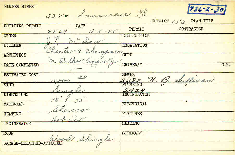 3326 Lansmere Road Shaker Heights, OH 44122 PARCEL ID: 736-02-030 Building Permit Date: 11-05-1925 Plan File Number: 3269, 5943, 11613 Microfilm Roll: Roll#47, Roll#80, NewRoll#8 Neighborhood: Fernway Owner: McGaw, J. R. Builder: Thompson, Chester A. Architect: Copper, Munroe Walker Jr. Estimated Cost: 11000 Kind: Single, Single Residence or Dwelling Material: Stucco Heating: Hot Air Roof: Wood Shingle |