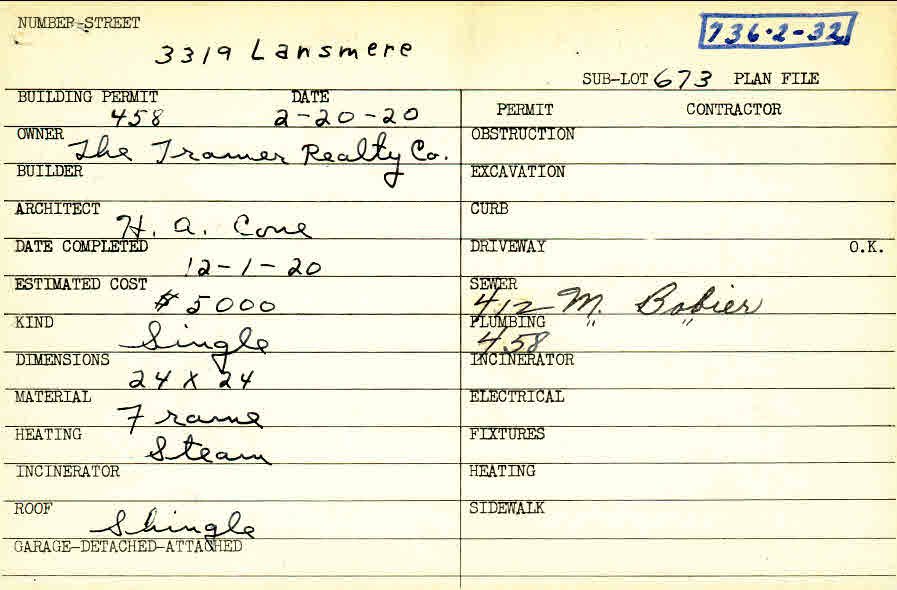 3319 Lansmere Road Shaker Heights, OH 44122 PARCEL ID: 736-02-032 Building Permit Date: 02-20-1920 Plan File Number: 9907, 12908 Microfilm Roll: Roll#105, NewRoll#18 Neighborhood: Fernway Owner: The Tramer Realty Company Architect: Cone, Harry A. Estimated Cost: 5000 Date Completed: 12-01-1920 Kind: Single, Single Residence or Dwelling Material: Frame Heating: Steam Roof: Shingles |