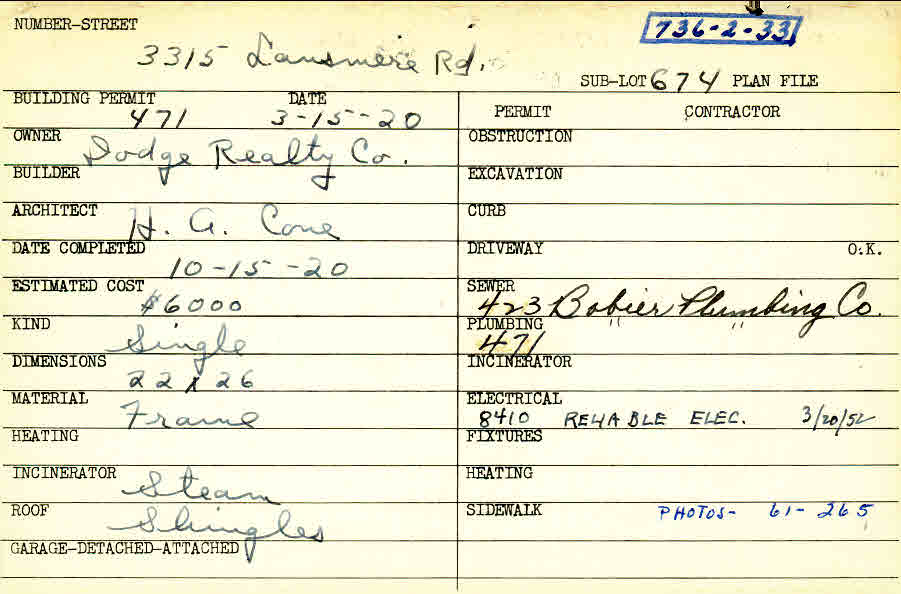 3315 Lansmere Road Shaker Heights, OH 44122 PARCEL ID: 736-02-033 Building Permit Date: 03-15-1920 Neighborhood: Fernway Owner: Dodge Realty Company Architect: Cone, Harry A. Estimated Cost: 6000 Date Completed: 10-15-1920 Kind: Single, Single Residence or Dwelling Material: Frame Heating: Steam Roof: Shingles Blueprints: no blueprints on microfilm |
