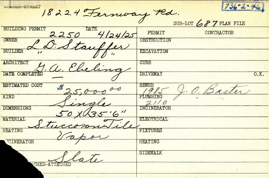 18224 Fernway Road Shaker Heights, OH 44122 PARCEL ID: 736-02-046 Building Permit Date: 04-24-1925 Plan File Number: 0 Neighborhood: Fernway Owner: Stauffer, L.D. Builder: Stauffer, L.D. Architect: Ebeling, G.A. Estimated Cost: 25000 Kind: Single, Single Residence or Dwelling Material: Stucco and Tile Heating: Vapor Roof: Slate Card Available: yes |