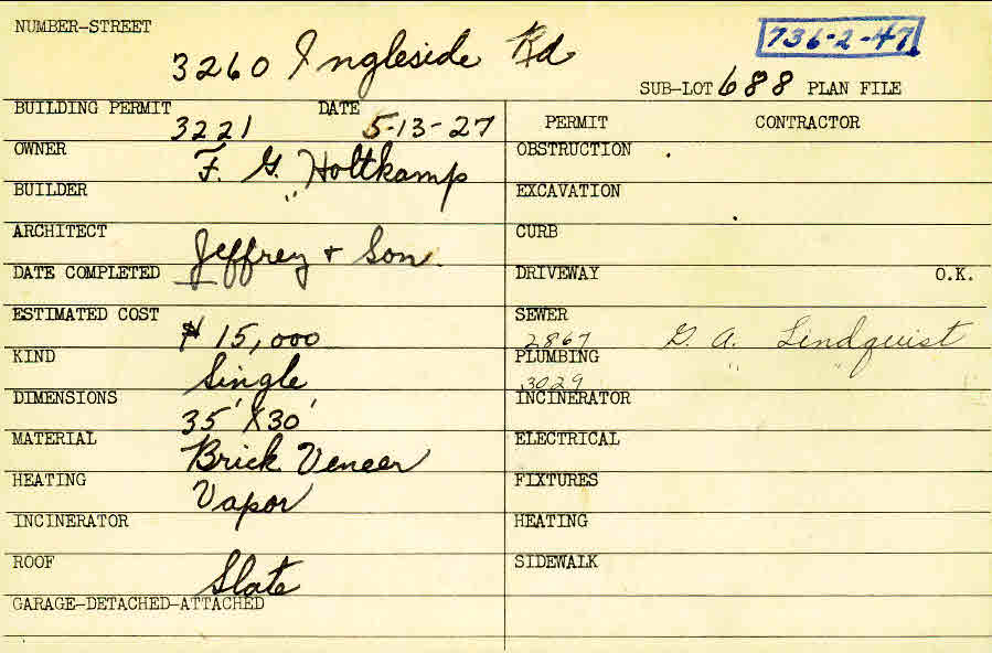 3260 Ingleside Road Shaker Heights, OH 44122 PARCEL ID: 736-02-047 Building Permit Date: 05-13-1927 Plan File Number: 0 Neighborhood: Fernway Owner: Holtkamp, F. G. Builder: Holtkamp, F. G. Architect: Jeffrey and Son Estimated Cost: 15000 Kind: Single, Single Residence or Dwelling Material: Brick Veneer Heating: Vapor Roof: Slate Card Available: yes |