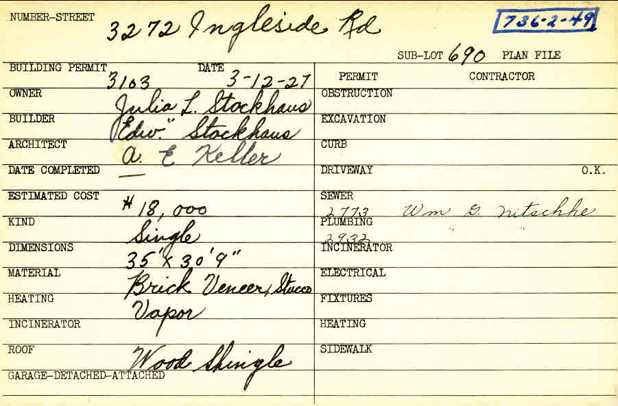 3272 Ingleside Road Shaker Heights, OH 44122 PARCEL ID: 736-02-049 Building Permit Date: 03-12-1927 Plan File Number: 0 Neighborhood: Fernway Owner: Stockhaus, Julia L. Builder: Stockhaus, Edward Architect: Keller, Arthur Emil Estimated Cost: 18000 Kind: Single, Single Residence or Dwelling Material: Brick Veneer and Stucco Heating: Vapor Roof: Wood Shingle |