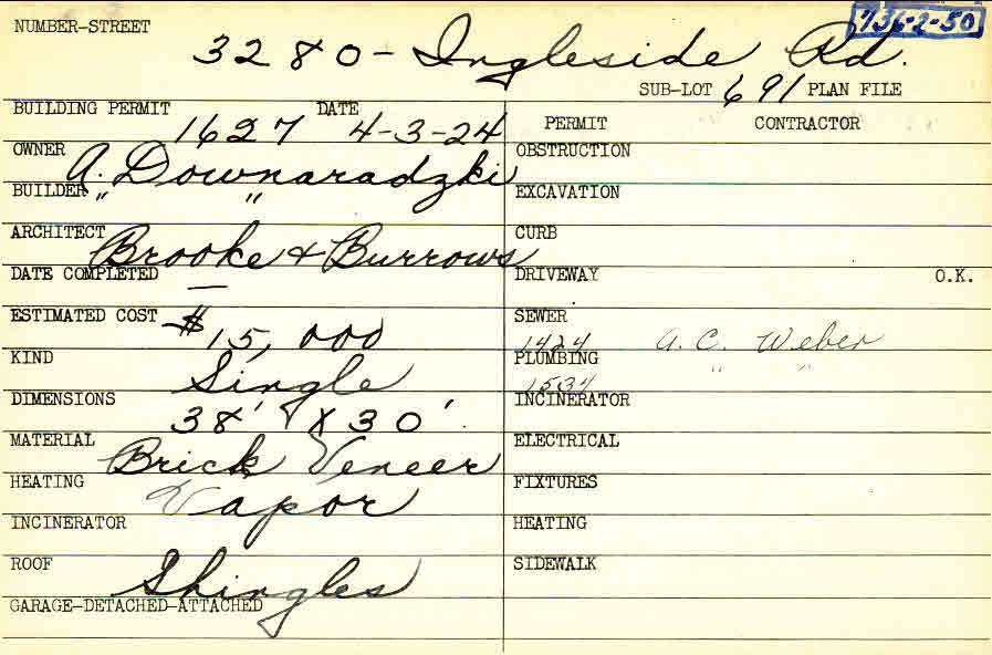 3280 Ingleside Road Shaker Heights, OH 44122 PARCEL ID: 736-02-050 Building Permit Date: 04-03-1924 Neighborhood: Fernway Owner: Downaradzki, A. Builder: Downaradzki, A. Architect: Brooke and Burrows Estimated Cost: 15000 Kind: Single, Single Residence or Dwelling Material: Brick Veneer Heating: Vapor Roof: Shingles Blueprints: no blueprints on microfilm |
