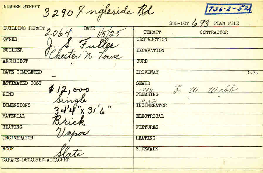 3290 Ingleside Road Shaker Heights, OH 44122 PARCEL ID: 736-02-052 Building Permit Date: 01-05-1925 Plan File Number: 0 Neighborhood: Fernway Owner: Fuller, J. S. Builder: Lowe, Chester N. Architect: Lowe, Chester N. Estimated Cost: 12000 Kind: Single, Single Residence or Dwelling Material: Brick Heating: Vapor Roof: Slate Card Available: yes |