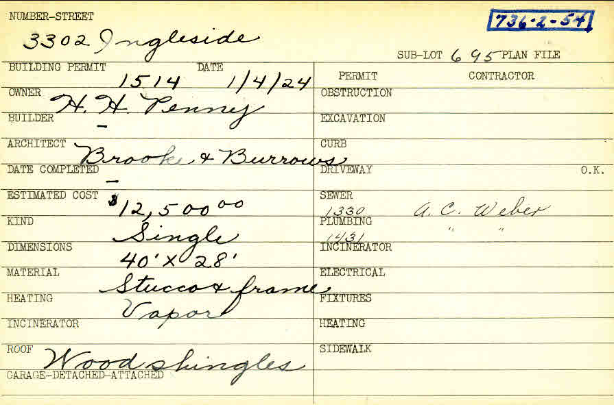 3302 Ingleside Road Shaker Heights, OH 44122 PARCEL ID: 736-02-054 Building Permit Date: 01-04-1924 Neighborhood: Fernway Owner: Penney, H. H. Builder: Penney, H. H. Architect: Brooke and Burrows Estimated Cost: 12500 Kind: Single, Single Residence or Dwelling Material: Stucco and Frame Heating: Vapor Roof: Wood Shingle Blueprints: no blueprints on microfilm |