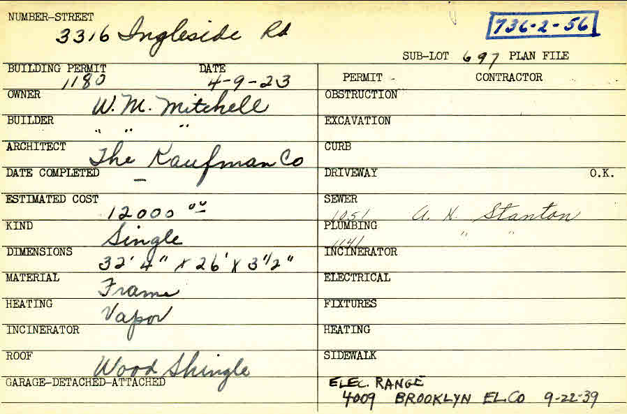 3316 Ingleside Road Shaker Heights, OH 44122 PARCEL ID: 736-02-056 Building Permit Date: 04-09-1923 Plan File Number: 0 Neighborhood: Fernway Owner: Mitchell, W. M. Builder: Mitchell, W. M. Architect: The Kaufman Company Estimated Cost: 12000 Kind: Single, Single Residence or Dwelling Material: Frame Heating: Vapor Roof: Wood Shingle |