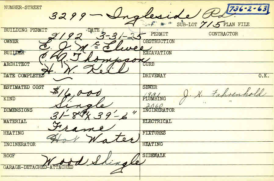 3299 Ingleside Road Shaker Heights, OH 44122 PARCEL ID: 736-02-063 Building Permit Date: 03-31-1925 Plan File Number: 5758 all scanned Microfilm Roll: Roll078 Neighborhood: Fernway Owner: McElwee, E. J. Builder: Thompson, C. A. Architect: Keil, H. W. Estimated Cost: 16000 Kind: Single, Single Residence or Dwelling Material: Frame Heating: Hot Water Roof: Wood Shingle Blueprints: online, see link above |