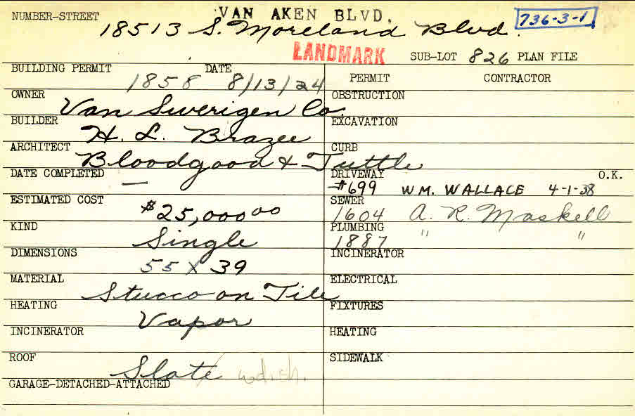 18513 Van Aken Boulevard Shaker Heights, OH 44120 PARCEL ID: 736-03-001 Building Permit Date: 08-13-1924 Plan File Number: 0 Neighborhood: Lomond Owner: Van Swerigen Company Builder: Brazee, H. L. Architect: Tuttle, Bloodgood Estimated Cost: 25000 Kind: Single, Single Residence or Dwelling Material: Stucco on Tile Heating: Vapor Roof: Wood Shingle |
