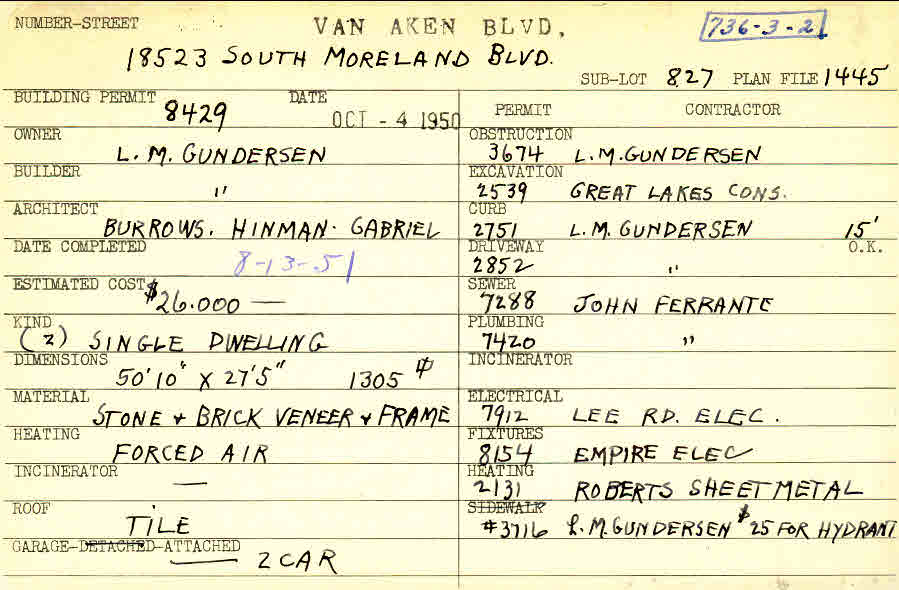 18523 Van Aken Boulevard Shaker Heights, OH 44120 PARCEL ID: 736-03-002 Building Permit Date: 10-04-1950 Plan File Number: 1445 scanned, 4631, 5269 Microfilm Roll: Roll016, Roll#65, Roll#72 Neighborhood: Lomond Owner: Gundersen, L. M. Builder: Gundersen, L. M. Architect: Burrows, Hinman, Gabriel Estimated Cost: 26000 Date Completed: 08-13-1951 Kind: Single, Single Residence or Dwelling (2) Material: Stone and Brick Veneer and Frame Heating: Forced Air Roof: Tile Garage: attached 2 car |