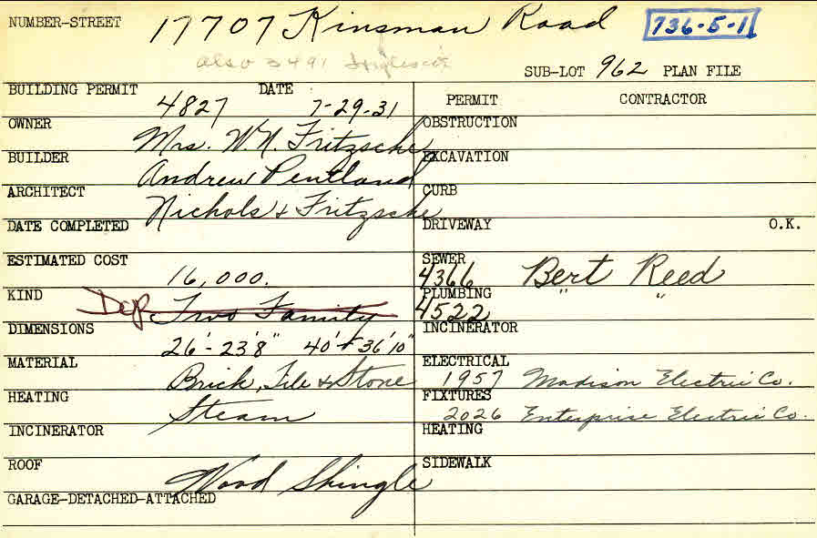 17707 Chagrin Boulevard Shaker Heights, OH 44122 PARCEL ID: 736-05-001 Building Permit Date: 07-29-1931 Neighborhood: Lomond Owner: Fritzsche, Mrs. W. N. Builder: Pentland, Andrew Architect: Nichols and Fritzsche Estimated Cost: 16000 Kind: Duplex or Two-Family Material: Brick, Tile & Stone Heating: Steam Roof: Wood Shingle Card Available: Yes Blueprints: no blueprints on microfilm |  |