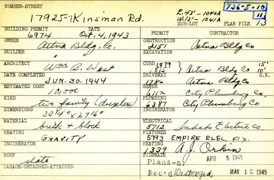 17927 Chagrin Boulevard Shaker Heights, OH 44120 PARCEL ID: 736-05-011 Building Permit Date: 10-04-1943 Plan File Number: 13 Neighborhood: Lomond Owner: Aetna Building Company Builder: Aetna Building Company Architect: West, William B. Estimated Cost: 10000 Date Completed: 06-30-1944 Kind: Duplex or Two-Family Material: Brick and Block Heating: Gravity System Roof: Slate |